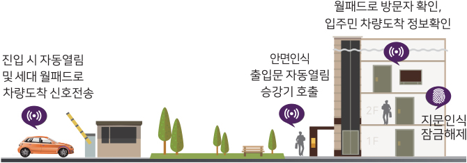 로비폰 안면인식을 통한 공동 현관문 자동열림, 엘리베이터 자동호출, 보안성이 높은 지문인식으로 잠금 해제되는 세대현관문 등의 스마트한 원패스 시스템을 갖추었습니다.