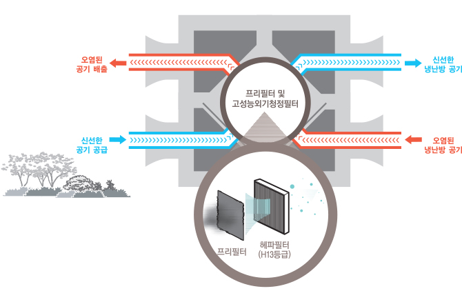 창문을 열지 않아도 실내의 오염된 공기를 밖으로 내보내주고 신선한 외부 공기를 실내로 공급해 쾌적한 실내공기를 유지시켜 줍니다.
